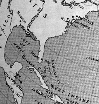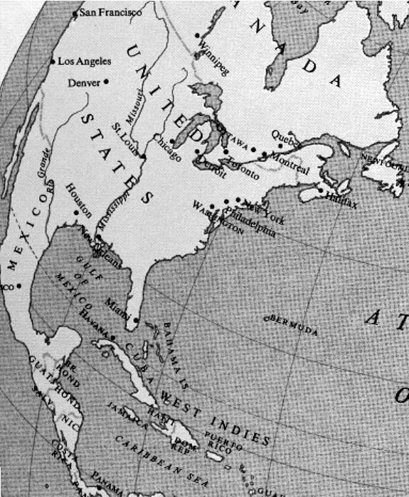 Modern orthographic projection map (left) compared with boulder coastline (right). The boulder map seems to have been based on a map, like the Piri Re'is map of AD 1519, using an orthographic or "azimuthal equidistant" type of projection. Several other maps of the Medieval period were based on this type of projection which was supposedly not invented until the 19th Century. Some experts, like Dr. Charles Hapgood of the University of New Hampshire and Capt. Arlington Mallory of the U.S. Navy's map department, believe that such maps, called "Portolans", were based on source maps made by some unknown ancient seafaring culture with sophisticated mathematical ability. Copies were handed down within certain families for hundreds or thousands of years. Columbus had a map of the New World and the West Indies, probably similar to the Piri Re'is Map and this modern one, when he set sail from Palos, Spain on August 3, 1492. This map is mentioned in his Log.![]()