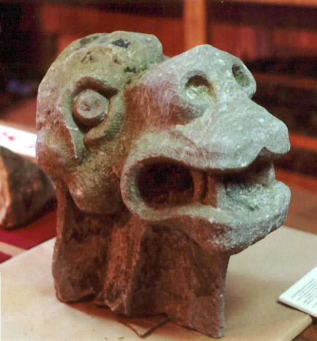 Joelle Lauriol at Memphremagog ruined dam, May 1997. Memphremagog “gargoyle”.Aside from the dam and the gargoyle which have been at least somewhat publicized, there are two other Lake Memphremagog finds that are so far known only to a few investigators. There is an iron-reinforced elm dugout canoe which has been in the Colby-Curtis Museum in Stanstead, Quebec since its discovery by a scuba diver some 30 feet down in Lake Memphremagog ten years ago . The former museum curator would never allow carbon dating of the wood because he feared that the canoe might be "pre-contact" in age, like the ruined dam. However, there is now a new curator and samples were taken for C-14 dating in late March 2001. Because of the backlog of tests at Isotech Labs at the University of Toronto, however, results will not be known to us before October 2001.