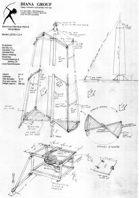 This windmill is not the most efficient design in the world, and cannot match the performance of sophisticated American, Aussie, Swiss, British and Kenyan horizonal-axis prop-mills mounted on high steel towers. On the other hand, these highly efficient mills are priced at around $35,000 (Can.) each, while wind-motors are currently priced at about $4000 each if the DIANA GROUP makes them. But with care, proper equipment, welding and mechanical skill and new or remanufactured auto parts, a wind-motor could be home-built to plans for about $1500, discounting labour. Less -- if you scrounge parts and material and do all the work yourself.