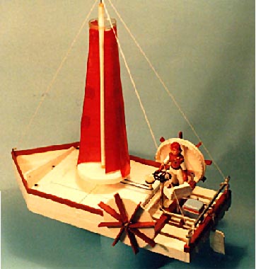 The small Canadian company failed, unfortunately, and I have no photos of their prototype. But here's a picture of a model paddle-wheeler on a Heyerdahl-esq “neo-raft” that I did for a friend. He never built it.